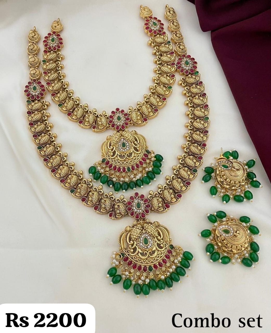 2 Temple-Style Necklaces – Detailed with goddess Lakshmi motifs, peacocks, and floral patterns, studded with red and green stones.